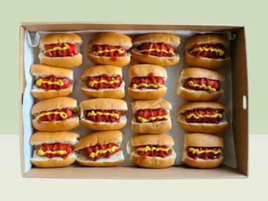 Mini hot dogs served in soft, fresh buns, topped with tomato sauce and mustard. For kids, please specify with or without mustard — a classic crowd-pleaser every time.