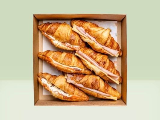 Freshly baked mini croissants filled with a selection of delicious savoury fillings, beautifully presented on a platter and perfect for meetings, events or office catering. Choose your 6 pack from the options listed below.
