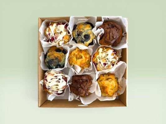 Delicious selection of freshly baked mini muffins in four popular flavours, perfect for meetings, morning teas or office catering. 2 × Chocolate, 3 × Raspberry & White Chocolate, 2 × Blueberry, 2 × Apple Cinnamon.