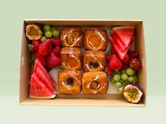 A selection of freshly baked mini-Danish pastries served with seasonal cut fruit - perfect for morning meetings and afternoon tea.