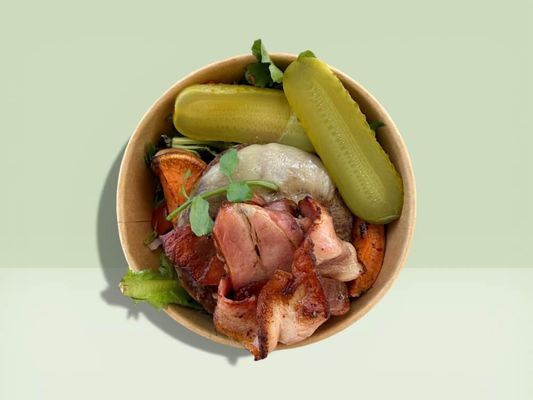 Beef pattie, crispy bacon, melted provolone cheese, gherkins, mix salad with mustard vinaigrette, mustard burger mayo & sweet potato wedges