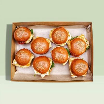 A box of bacon and egg sliders served on soft milk buns with fresh spinach, creamy aioli and our house-made relish.
