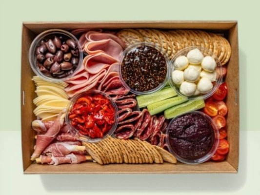 A curated antipasto platter with premium cured meats, cheeses and Mediterranean-style accompaniments. Includes salumi, cheeses, olives, roasted capsicum, dips, fresh vegetables and crackers - perfect for sharing at events and gatherings.