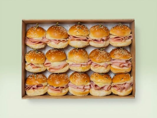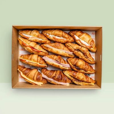 Freshly baked mini croissants filled with a selection of delicious savory fillings, beautifully presented on a platter and perfect for meetings, events or office catering. Choose your 12 pack from the options listed below.