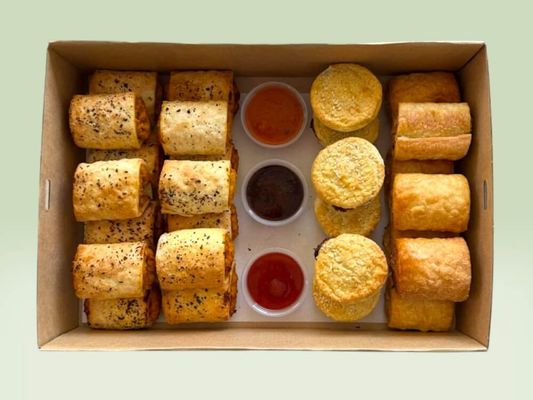 32-piece selection of baked savoury cocktail rolls and pies, including spinach & ricotta, homestyle pork sausage rolls, beef sausage rolls, and cocktail beef pies - a guaranteed crowd-pleaser. Serves 16 as side.