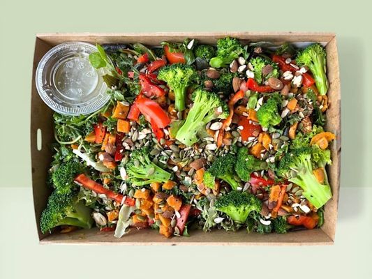 broccoli, pepitas, tomato, sweet potato, mix leaf, kale, capsicum, crushed almonds tossed with an herb dressing on the side. (gf/vg)