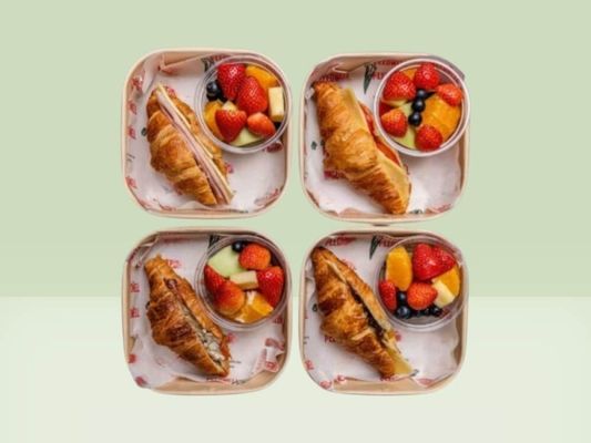Minimum 4x savoury filled croissant served with a side of seasonal cut fruit. Individually packed - simply select your quantity and preferred fillings.