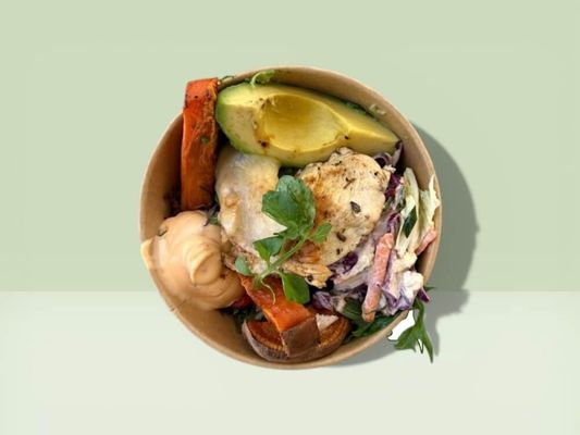 Grilled chicken, avocado, house slaw, melted provolone cheese, mix salad with mustard vinaigrette, side of chilli mayo & sweet potato wedges