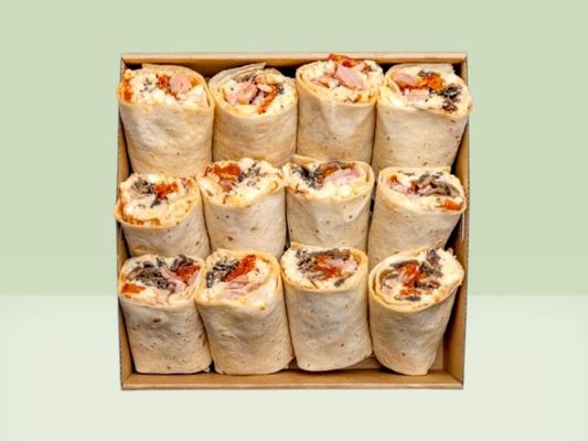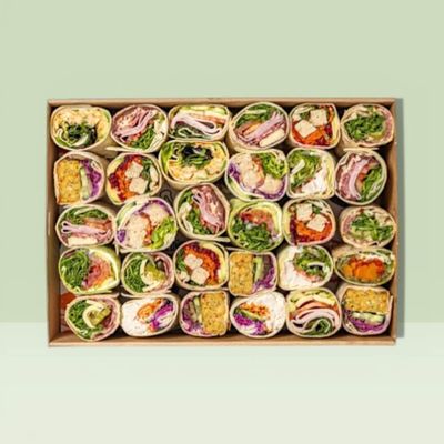 $14.00/ per person which starts at a minimum of 4 people. The option to add people is available. Each person receives one and a half wraps which translates to 3 pieces per person. All platters include 20% vegetarian fillings and. Please leave a note at checkout if you would like a higher or lower percentage of Veg in your platters. Depending on the size of your order, your catering may be presented across a mix of large and small platters for the best display.