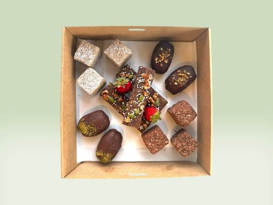 Raw treats to keep your body and belly happy. Free from refined sugar, dairy and gluten, these flavour-packed slices are handcrafted with thoughtful ingredients. Box includes 3x vanilla protein cubes, 3x chocolate protein cubes, 3x raw finger slices, 2x choc coated salted caramel peanut dates, 2x choc coated pistachio dates.
