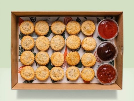 A selection of 20 freshly baked gourmet beef pies, served with BBQ sauce, house-made tomato relish and tomato sauce. Serves 10 as side.