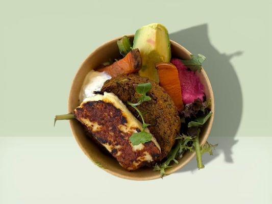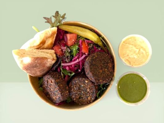 Vegan falafel, pickled red cabbage, house made green tahini dressing, mix leaf & quinoa tabouli salad, pita, hummus & sumac dip