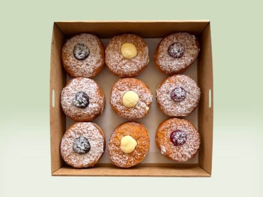A selection of 9x gourmet donuts filled with indulgent treats: 3 strawberry jam, 3 Nutella, and 3 Biscoff