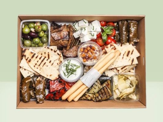 Enjoy a curated selection of Mediterranean favorites, perfect for sharing. This platter serves approximately 5-8 guests. Includes: • Grilled capsicum, eggplant & zucchini • Stuffed vine leaves • Hummus (DF) • Tzatziki (V/DF) • Marinated olives • Marinated artichokes • Danish feta • Olives • Cherry tomatoes • Pita bread • Grissini sticks