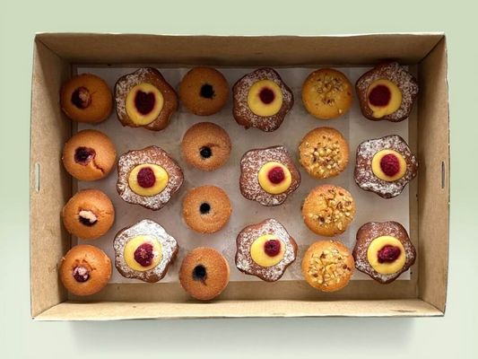21-piece gluten-free assortment of friands & delicate almond cakes and fruity bites with raspberry and passionfruit, tender, buttery, and full of flavor.
