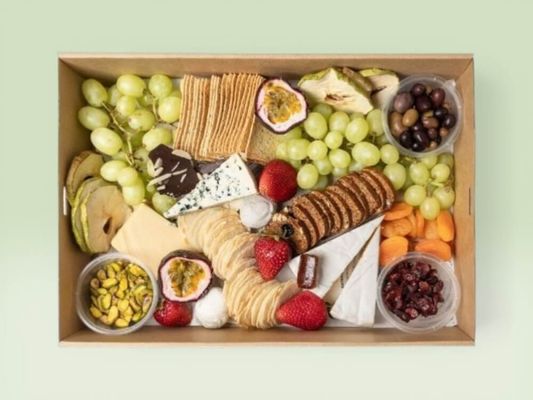This platter features a curated selection of premium cheeses, including blue, brie-style, vintage cheddar, and goat’s cheese, paired with a variety of sweet and savoury accompaniments. Includes quince paste, chocolate bark, green olives, dried apples, grapes, dried apricots, raisins, pistachios, and an assortment of crackers including gluten-free wafer, lavosh crackers, raisin & pecan crackers.