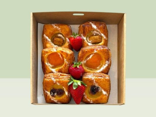 A selection of 6x freshly baked mini-Danish pastries with apple, apricot and cherry fillings, perfect for meetings, events and morning tea catering.