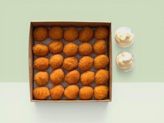 A selection of golden, crispy arancini balls with a rich, creamy centre, featuring three cheese, truffle porcini, and Italian tomato — offering a delicious variety of flavours, perfect for sharing at events and catering.