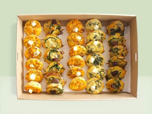 An assortment of handmade vegetarian cocktail frittatas, featuring a mixed selection of flavours including spinach & feta, pumpkin & feta, and Mediterranean — perfect for any occasion