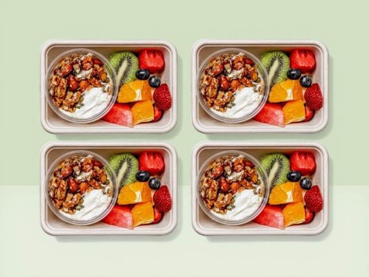 4x individual packs of yoghurt and granola cups served with seasonal fruit on the side - perfect for breakfast catering and morning meetings. Serves 4.