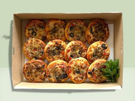12x Mini supreme pizzas (3.5in) offers a convenient savoury option combining tomato, cheese and salami-pork flavours for catering
